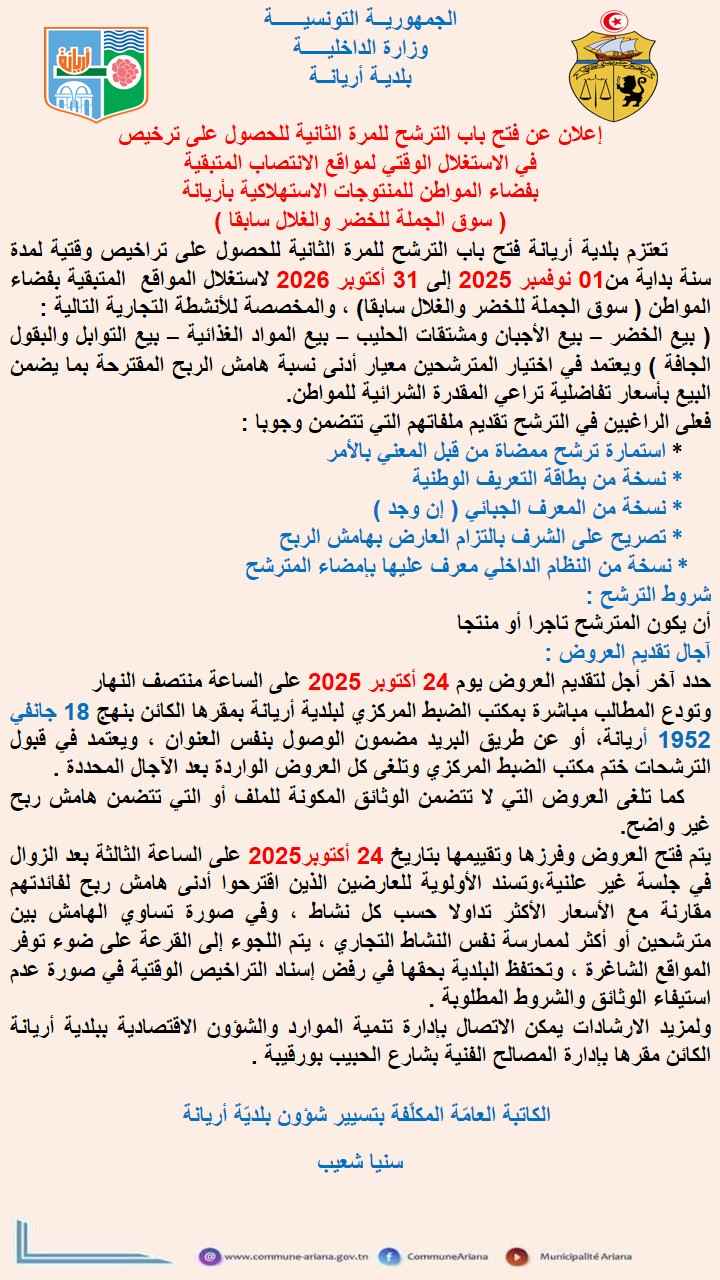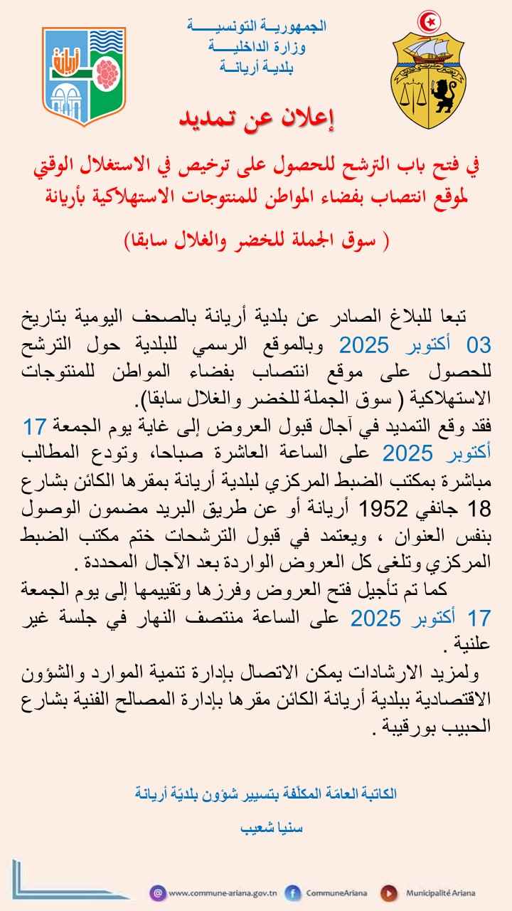 واكب السيد طه عبيدي معتمد اريانة المدينة بمعية السيدة سنيا شعيب المكلفة بتسيير شؤون البلدية اليوم السبت 20 سبتمبر 2025 بحضور ممثلي ادارة المصالح الفنية  تواصل اشغال :