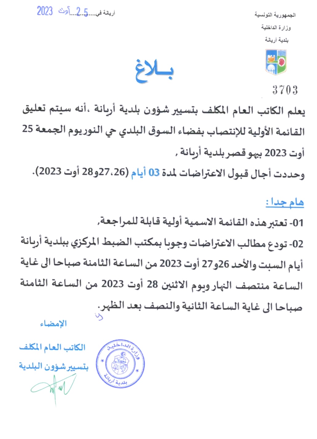 بإشراف السيد خالد النوري والي اريانة و بحضور سعادة سفير فلسطين والمعتمدة الاولى للولاية و معتمد اريانة والكاتب العام للبلدية ونائبة مجلس النواب عن جهة اريانة والمندوبة الجهوية للشؤون الثقافية والمدير الجهوي للشؤون الاجتماعية وأعضاء المجلس المحلي ورئيس الاتحاد الجهوي للصناعة والتجارة والصناعات التقليدية والنائبة الجهوية للاتحاد الوطني للمرأ ة واطارات واعوان بلدية اريانة وممثلين عن الادارات الجهوية للمرأة والاسرة والشباب والرياضة و الجمعيات وممثلي المجتمع المدني